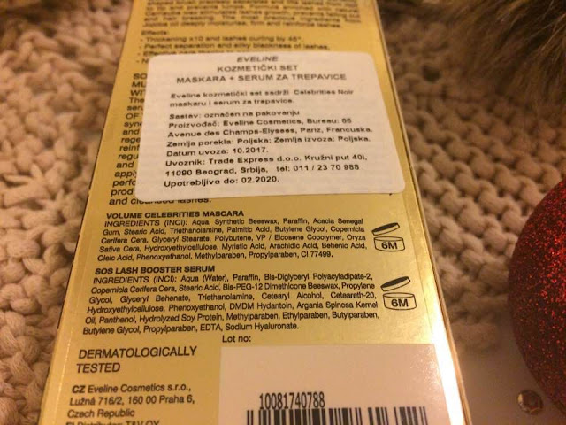 EVELINE KOZMETIČKI SET sadrži Volume Celebrities Noir maskaru i Sos serum 5 u 1 za trepavice sa argan uljem. Odavno sam imala želju da probam Eveline serum za trepavice, a sada je bila odlična prilika. Pronašla sam ga u dm drogeriji na sniženju, ali moram priznati da se i sa punom cenom i više nego isplati kupiti ga u setu sa maskarom. Platila sam ga 595 dinara (puna cena 849 dinara). Zapremina i maskare i seruma je po 10 ml što je takodje obećavalo da treba probati ove proizvode.